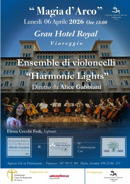 VIAREGGIO: Lunedì 6 aprile ore 18,00 -Grand Hotel Royal g.c. dalla collaborazione con la nostra Associazione, la Direzione del Grand Hotel Royal e il Circolo Musicale A.Catalani di Lucca e Porcari; sarà offerto, un Concerto di un Ensemble di Giovani Violoncellisti, con la soprano Elena...