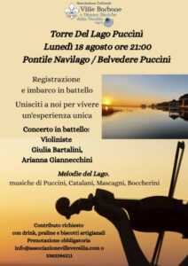 Unisciti a noi per vivere un’esperienza unica, rimanendo sul battello, ascolteremo,al Concerto, Le melodie del Lago. Due violiniste:  Giulia Bartalini e Arianna Giannecchini, eseguiranno musiche di Puccini, Catalani, Mascagni, Boccherini.. un nostro tributo a Giacomo Puccini e ad altri grandi compositori. Sarà un’occasione per trascorrere una festa di musica in un ambiente naturale, in mezzo a questo Lago, che ha dato e continua a dare emozioni. Opportunità di vivere una serata particolare, dove non mancherà un brindisi e l’assaggio delle praline di Puccini ideate dall’Azienda Mr Pic e dei biscotti artigianali “Fortini” – Contributo richiesto  soci 30€ non associati 35€ – minimo partecipanti 20